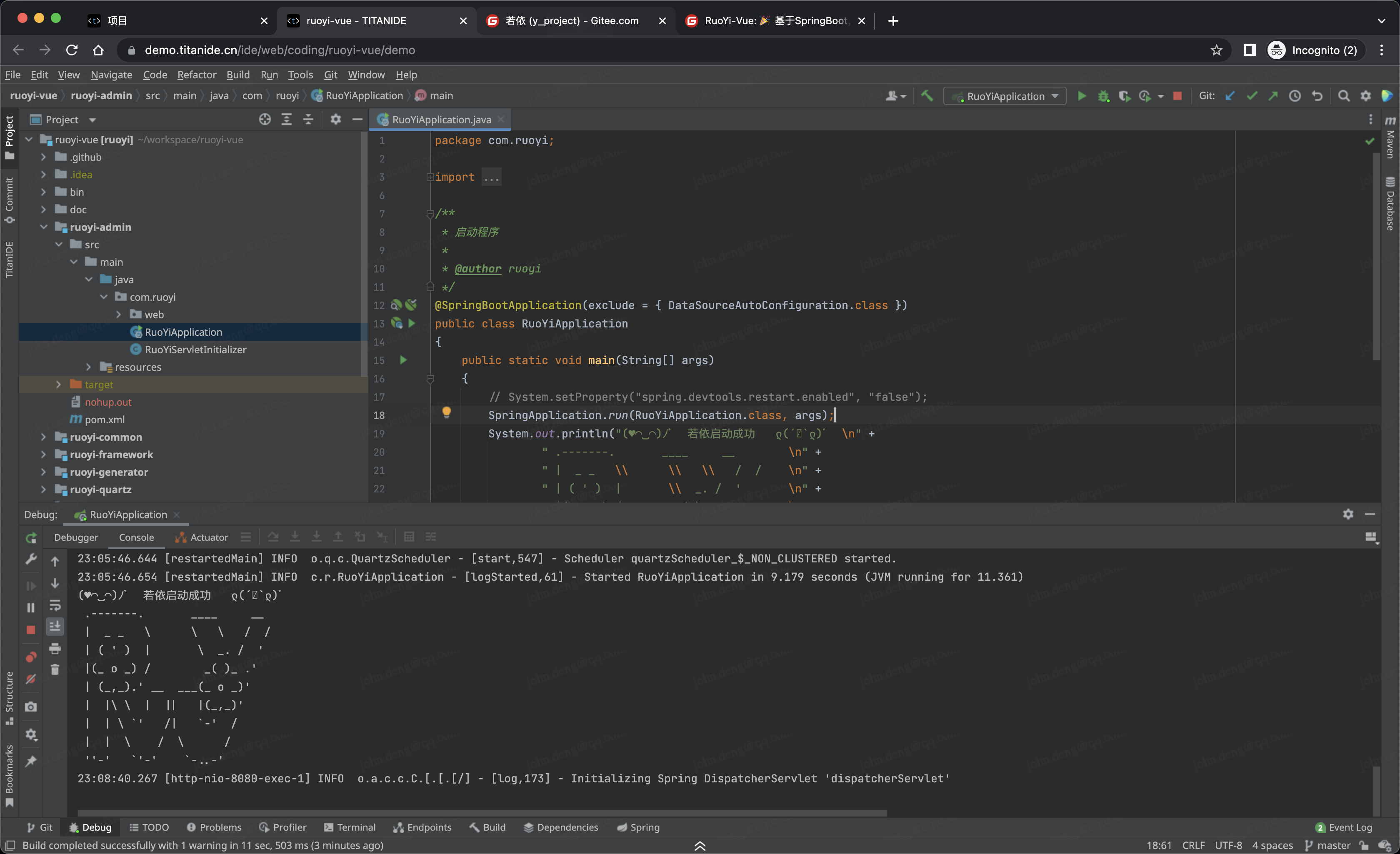 我通过 [TitanIDE] 定制了 RuoYi 开发环境模板,然后在另外套环境导入模板并一键创建 RuoYi 的开发环境,在短短的 5 分钟内,一个完整的 RuoYi 开发环境就呈现在您的眼前了。