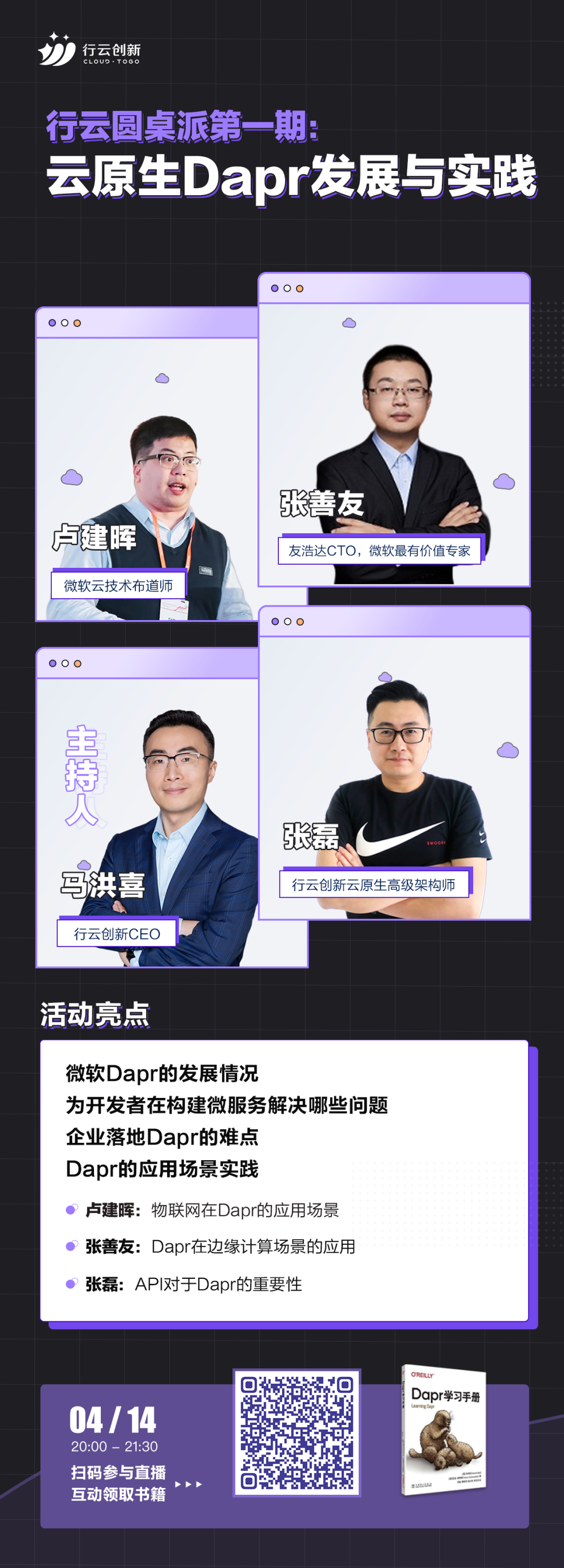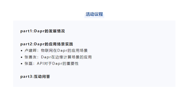 4月14日晚上8点,《行云圆桌派第一期:云原生Dapr的发展与实践》直播来啦!活动由kaiyun开云创新CEO马洪喜,微软最有价值专家、.NET技术专家张善友,微软云技术布道师卢建晖,kaiyun开云创新云原生架构师张磊四位嘉宾与大家聊聊Dapr的发展情况和落地遇到的问题、Dapr应用场景实践、未来展望等。